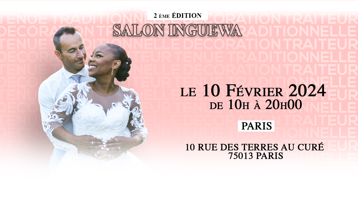 La salle MAS du treizième arrondissement se transformera en une ambiance vibrante aux accents des festivités africaines. Lancé par JadEvents et Traiteur Boua, le Salon « Inguewa » est l’unique rendez-vous à Paris et sa région réunissant une variété de spécialistes en costumes, décoration, musique et cuisine liés aux mariages et autres festivités africaines.
