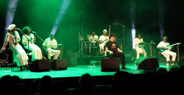 Trente minutes après, c’est la ruée totale aux trois portiques de sécurité de la grande scène! Le temps de petits attroupements et de petits moments de curiosité et d’echanges, la salle se remplie. Chacun est à sa place! La Fête à Keïta peut donc commencer. 19h00, en chef de village moderne, avec en arrière-plan sa tribu musicale plutôt conservatrice, Salif Keïta s’installe sur son trône. Habillé d’un tee-shirt noir aux écriteaux dorés avec un chapeau melon et des lunettes noires, il se lance à la conquête de la classe moyenne suédoise. Le contexte est bien situé avec en intro un blues très mandingue. Comme pour dire que ce soir c’est l’Afrique qui est à l’honneur.